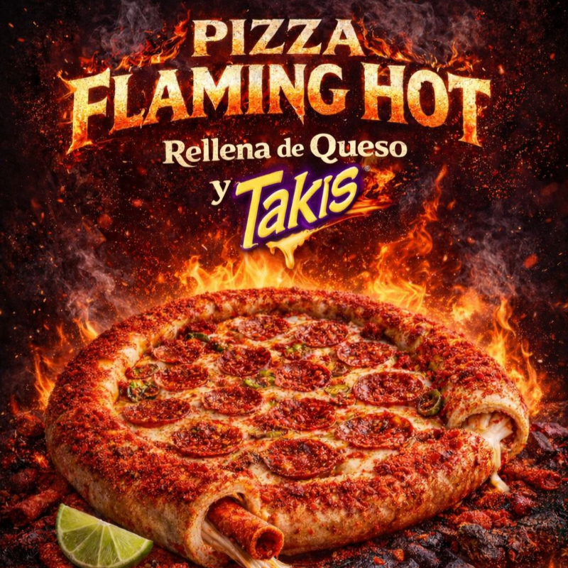 1 pizza grande de peperoni bañada con polvo Flaming Hot con una orilla de queso y takis fuego.