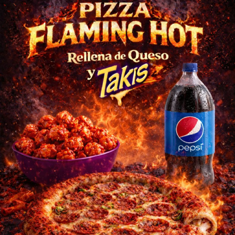 1 pizza grande de peperoni bañada con polvo Flaming Hot con una orilla de queso y takis fuego.
