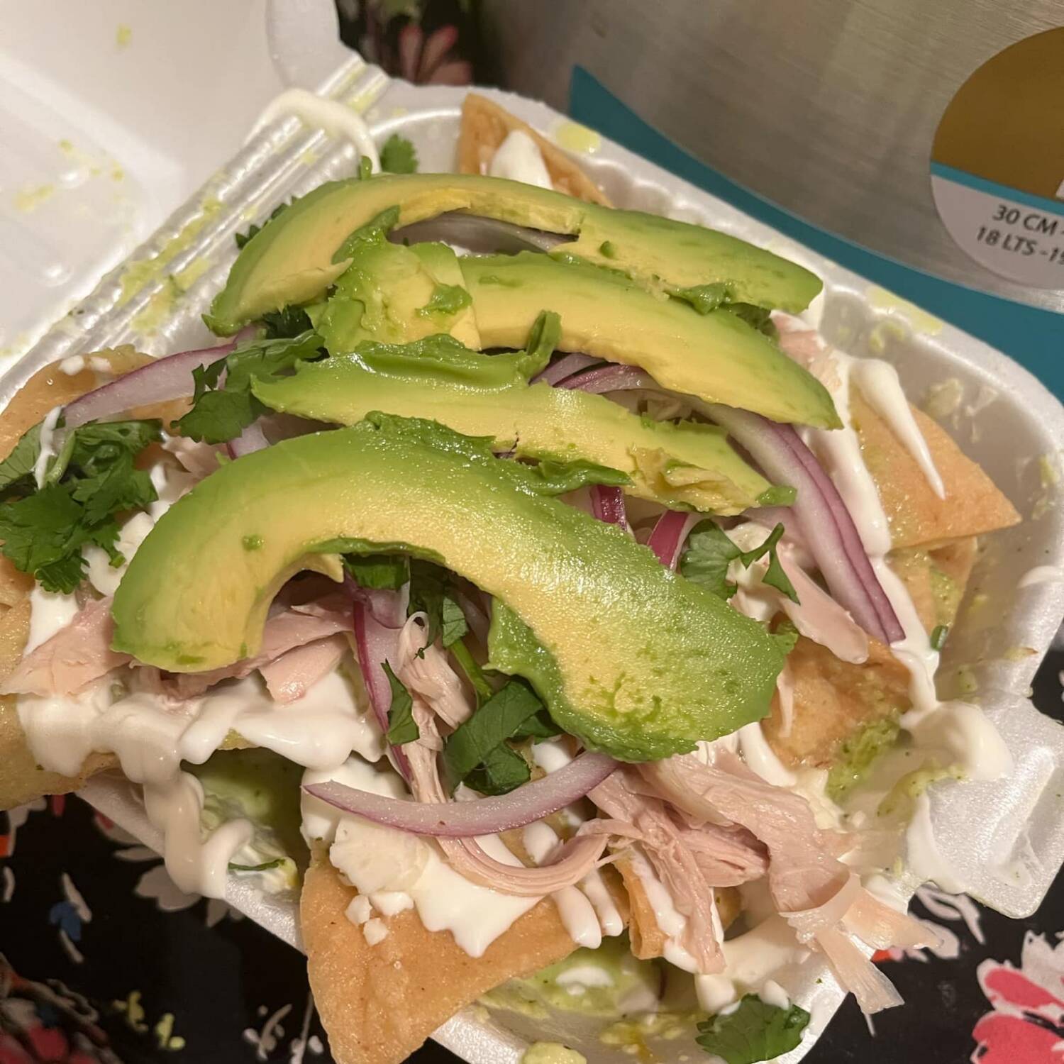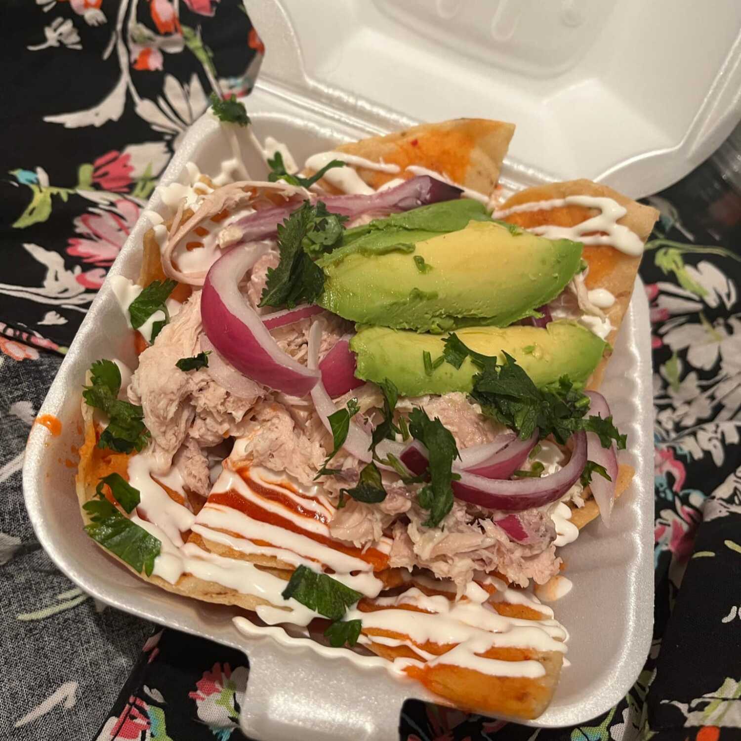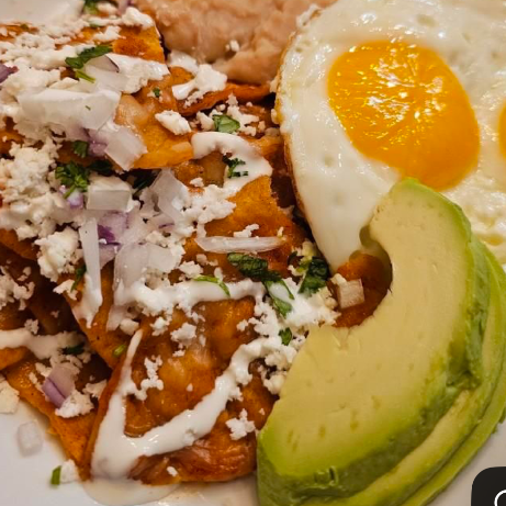 Chilaquiles bañados en salsa roja acompañado de crema, aguacate, cilantro, cebolla morada y queso