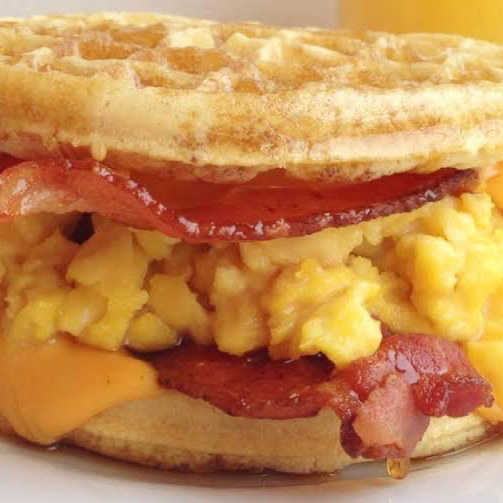 Waffles con queso amarillos huevo revuelto y jamones dorados