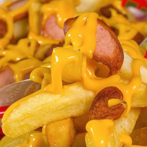 Trocitos de salchicha con papas a la francesa y queso amarillo