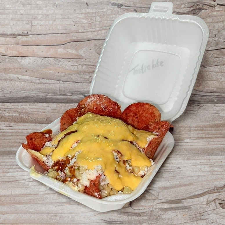 Duro rectangular, repollo, cueritos, aguacate, tomate, soya, crema y salsa