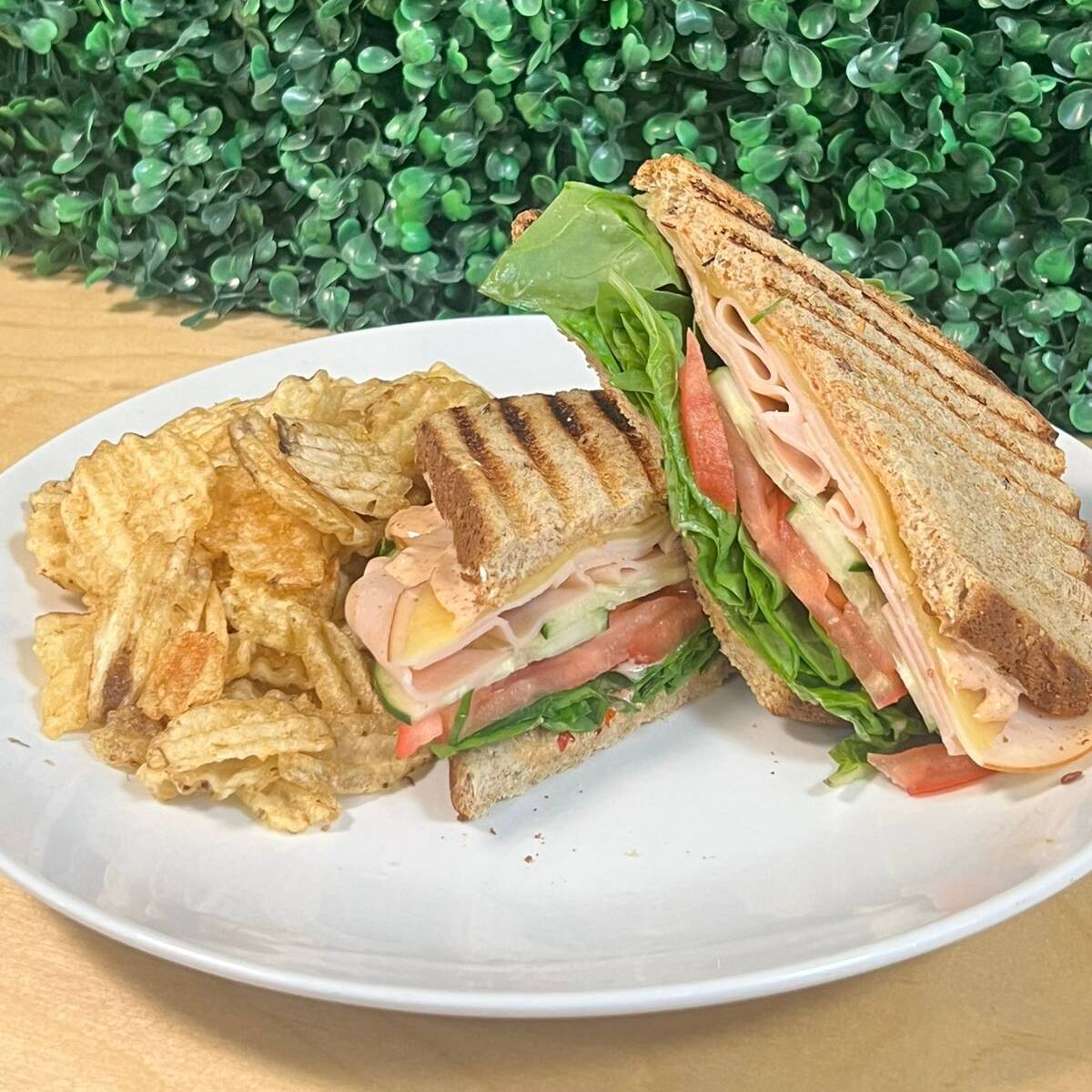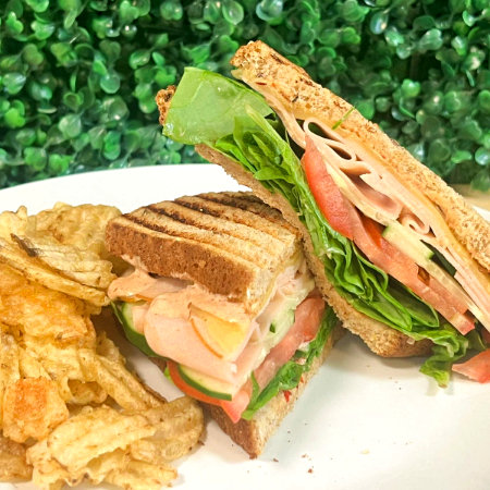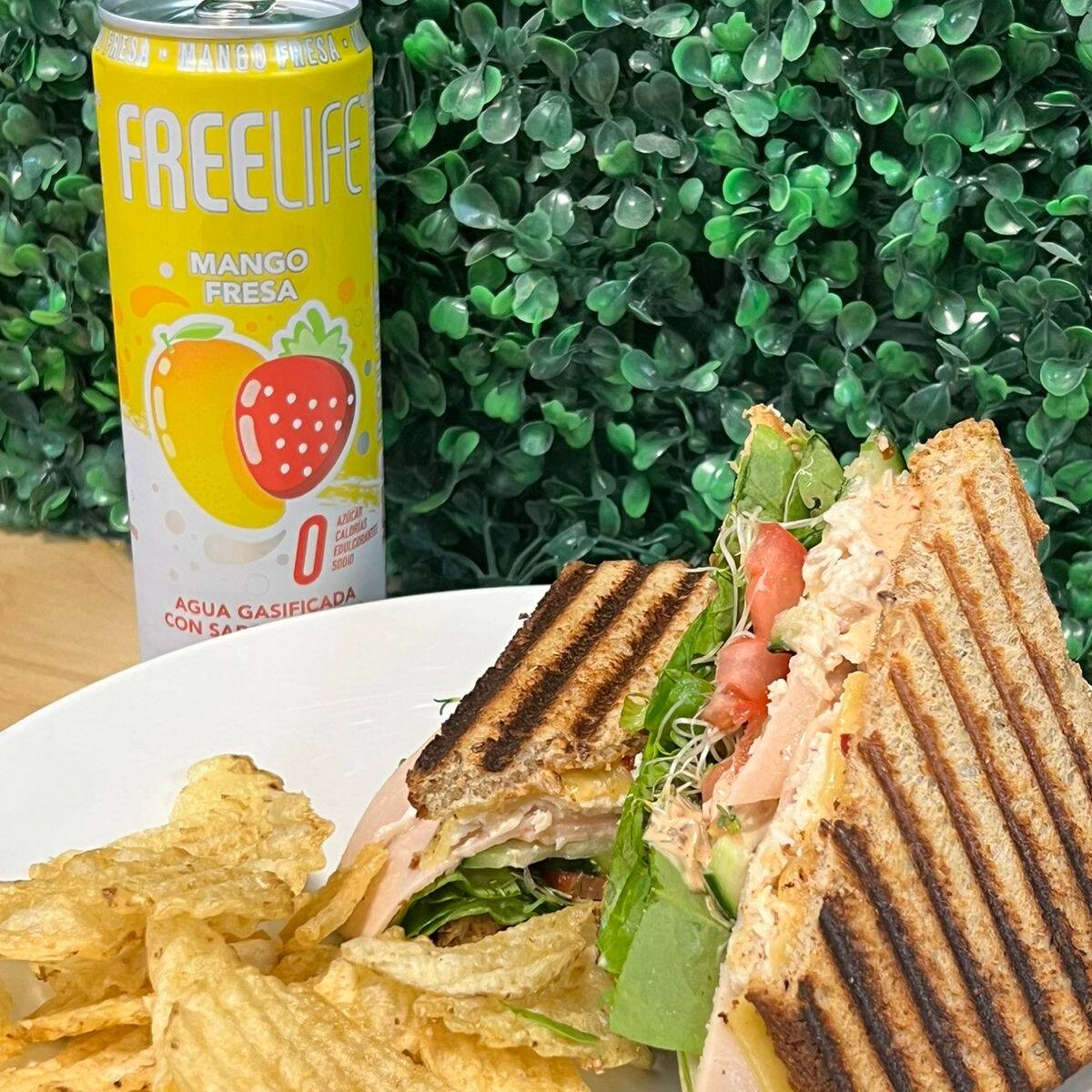 Pan de masa madre de 12 granos, jamón de pavo, pollo desmenuzado, queso manchego, mix de lechugas, tomate y pepino frescos, germinado, y mayonesa, acompañado de papas estilo chips.