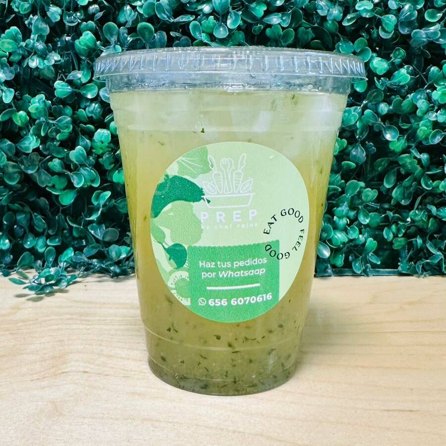 Elaborado a base de jugo de naranja natural, espinaca, apio, manzana, pepino, limón, menta y piña. (Dulzor puede variar por la madurez de la fruta o la temporada).