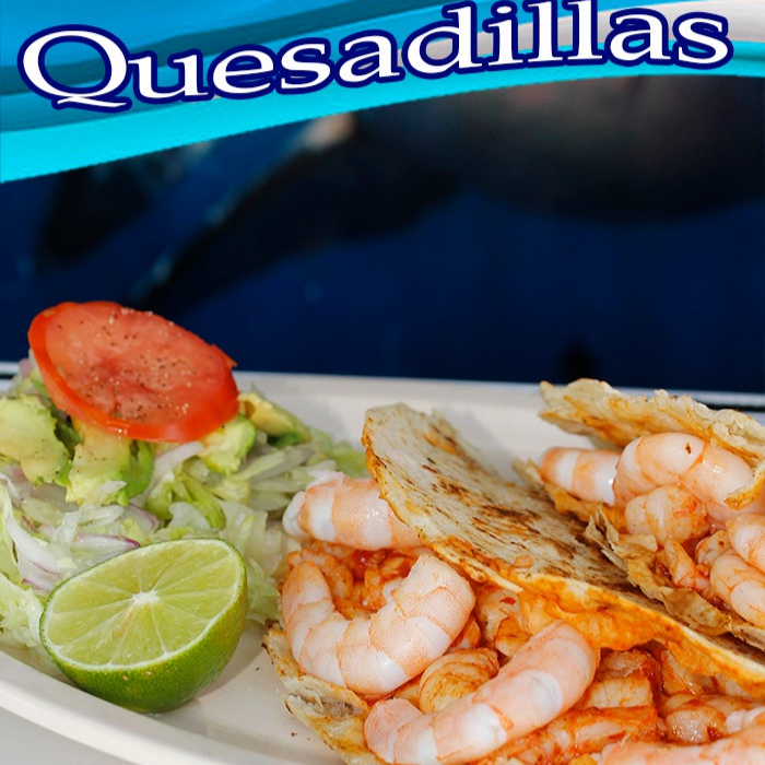 Quesadilla de harina o de maiz con queso gratinado y camaron, acompañado de ensalada con aguacate aderezada con limón, aceite de oliva, sal y pimienta.