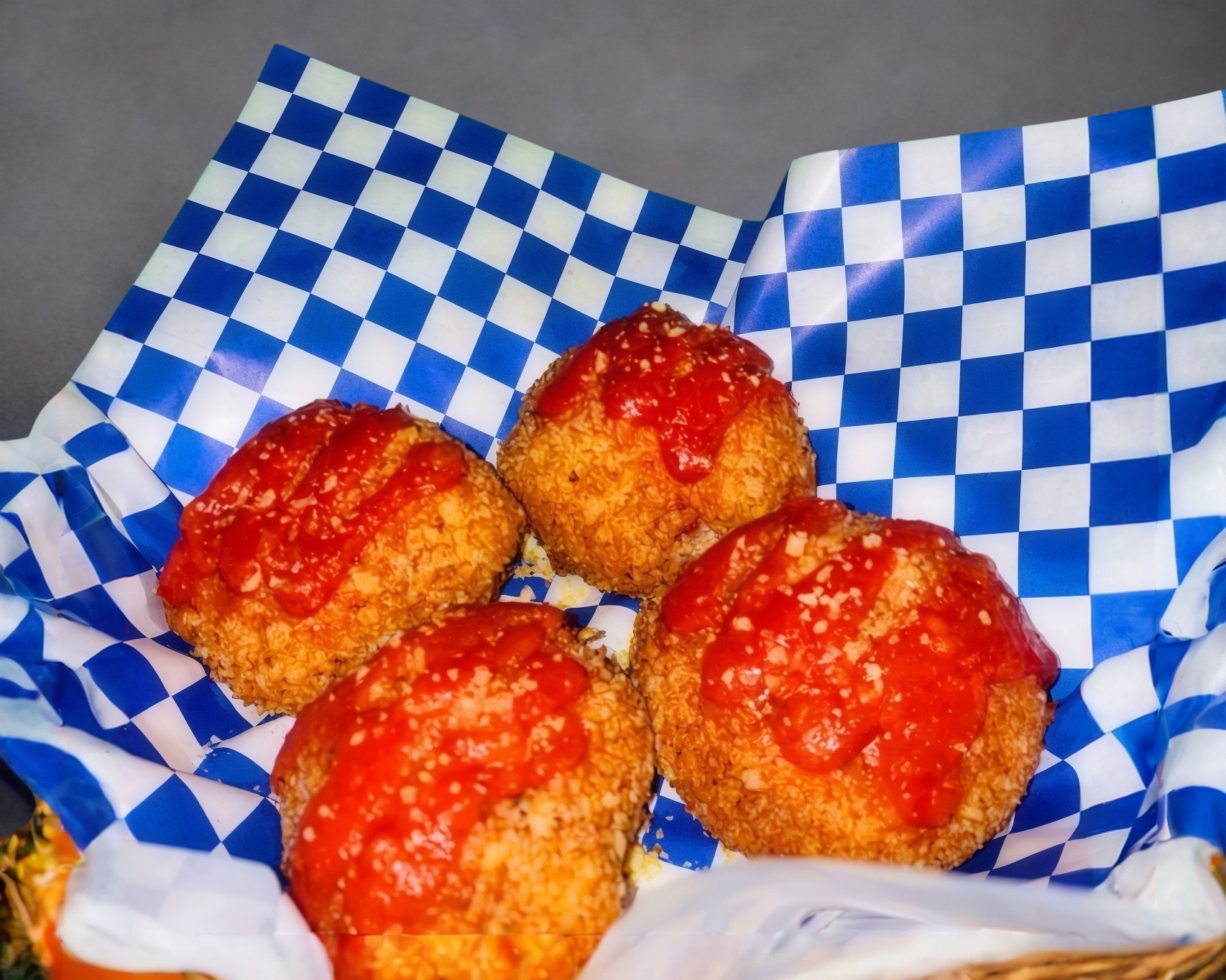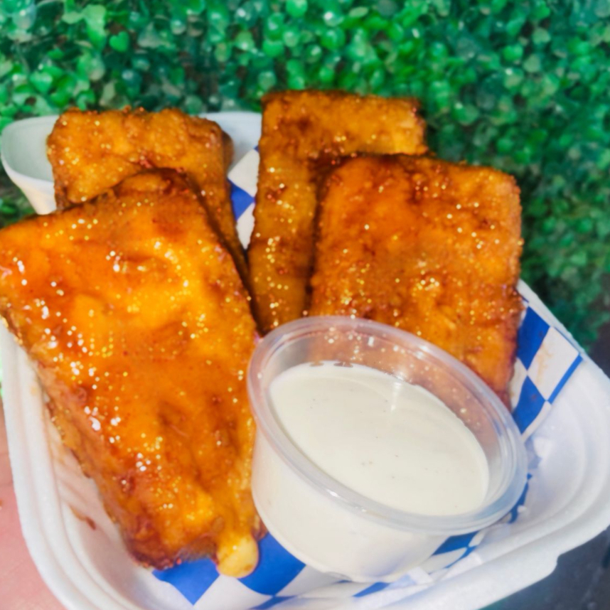 Queso mozarella empanizado con la receta de la casa y bañado en salsa bbq