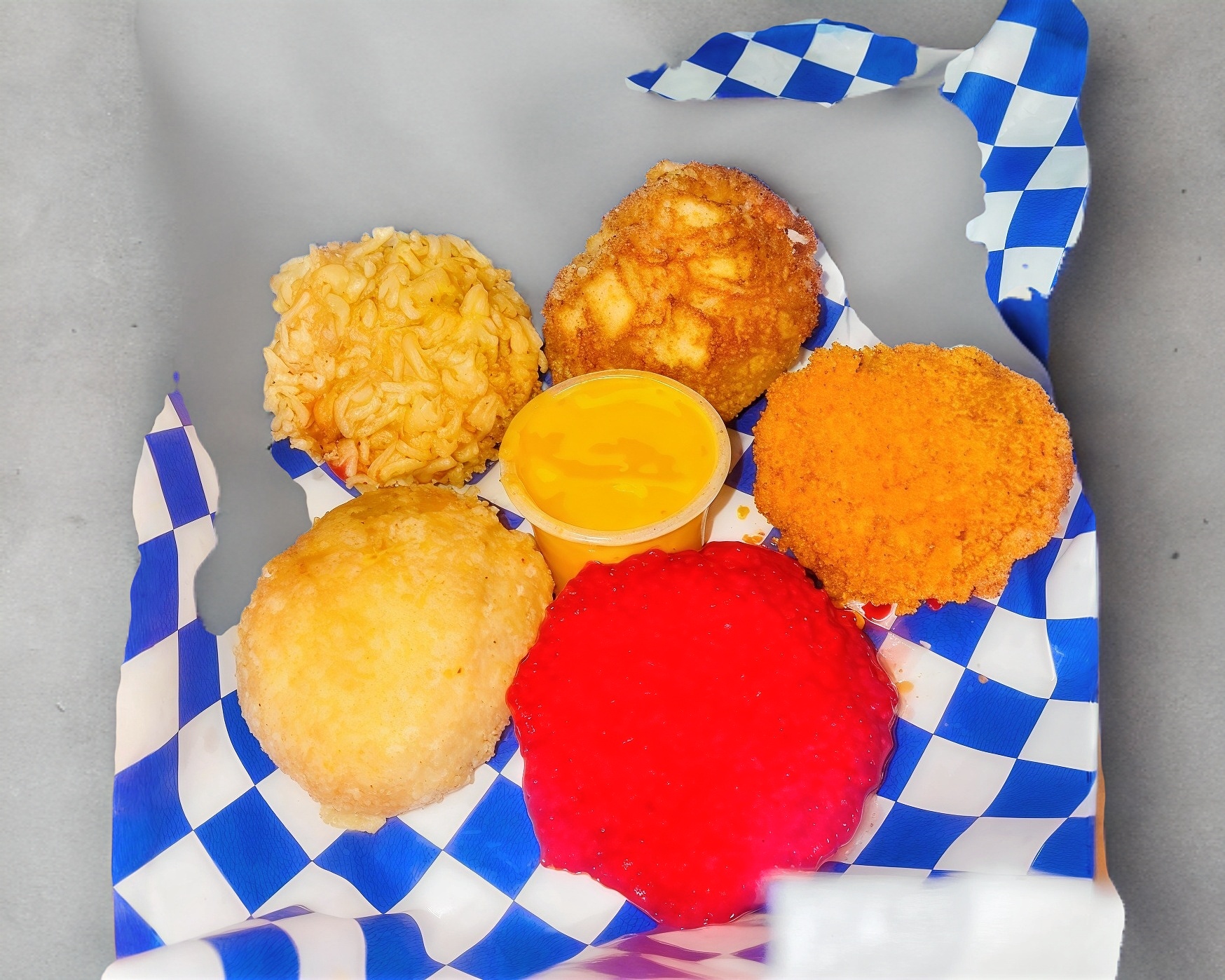 5 flavor bomb rellenas de queso / salchicha con cubiertas mixtas y aderezós a elección