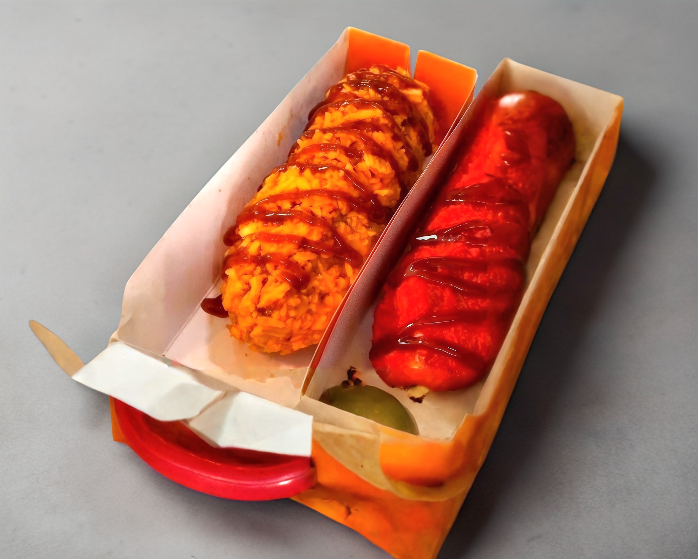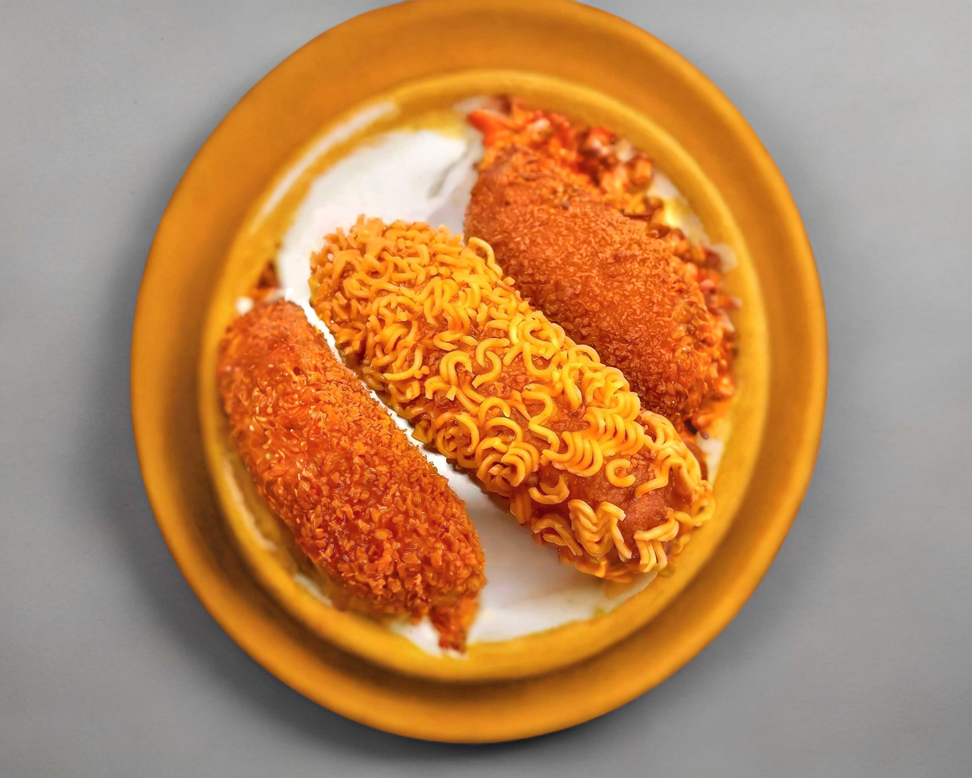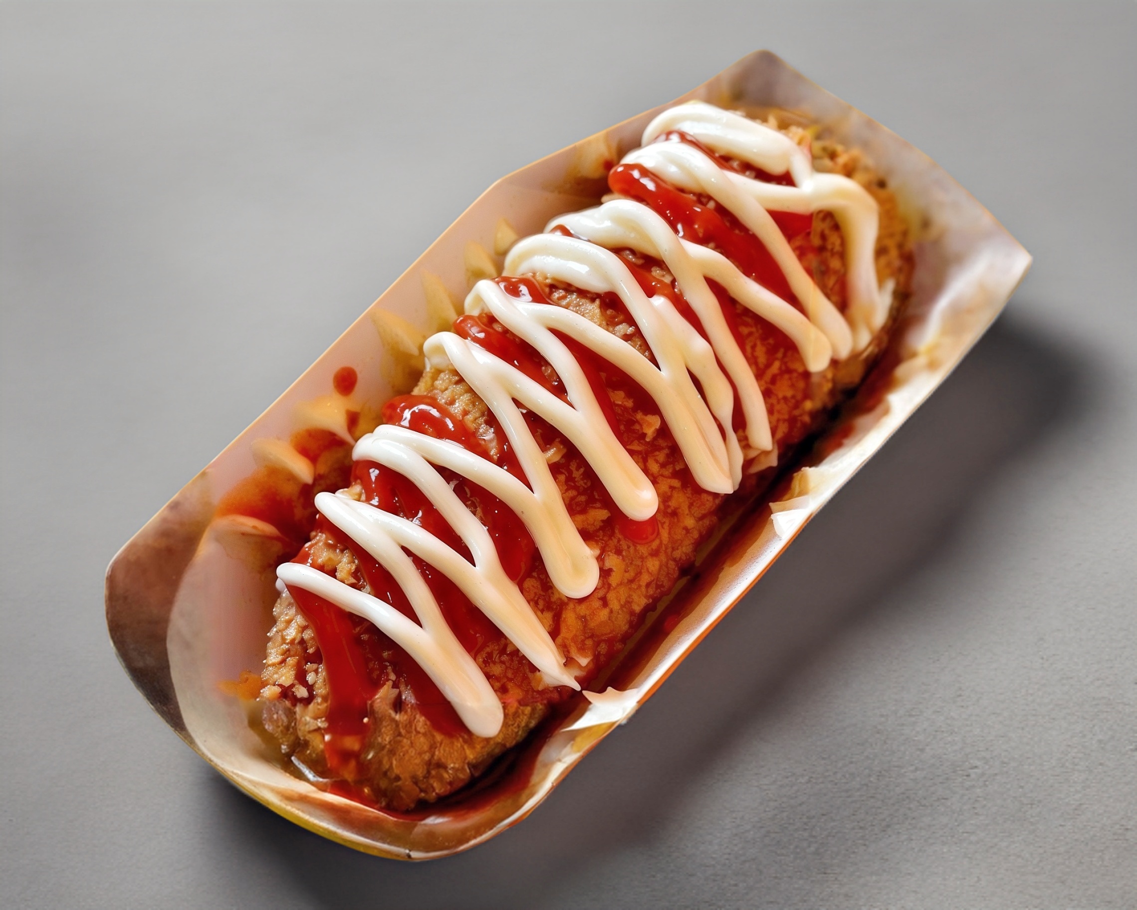 1 banderilla mitad salchicha de pavo, mitad queso gouda con cubierta ramen