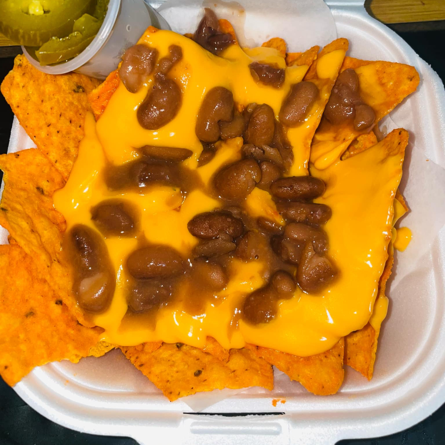 Doritos rojos con queso amarillo, frijoles, chiles curtidos
