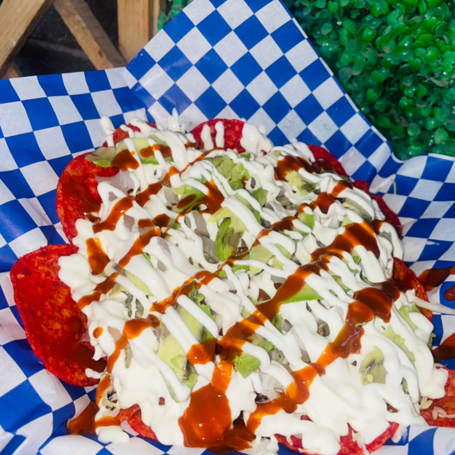 1 Banderilla Rellena de queso gouda, cubierta de Doritos y queso para nachos
