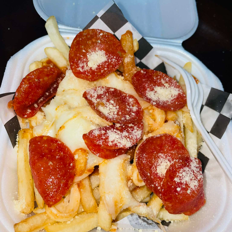 Papas fritas , salsa para pizza, queso derretido, pepperoni y queso parmesano