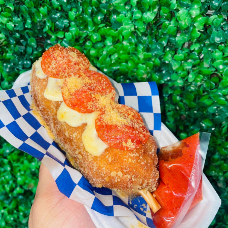 1 Banderilla Rellena de pepperoni y queso, con cubierta natural, queso gratinado y pepperoni