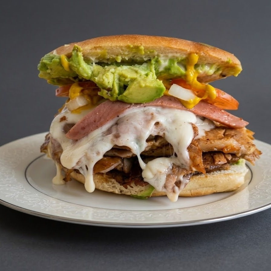 Elaborada con pan artesanal, 300 g de jugosa carne de pastor a la plancha, acompañado de suculento jamón, winnie, queso menonita, aguacate fresco, mayonesa, lechuga, tomate y cebolla.