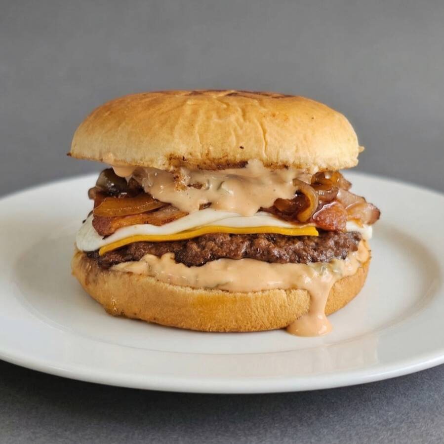 Deliciosa smash Burger Pan brioche, Triple .carne 100% sirloin smash, queso amarillo, queso asadero, cebolla caramelizada y aderezo americano.
