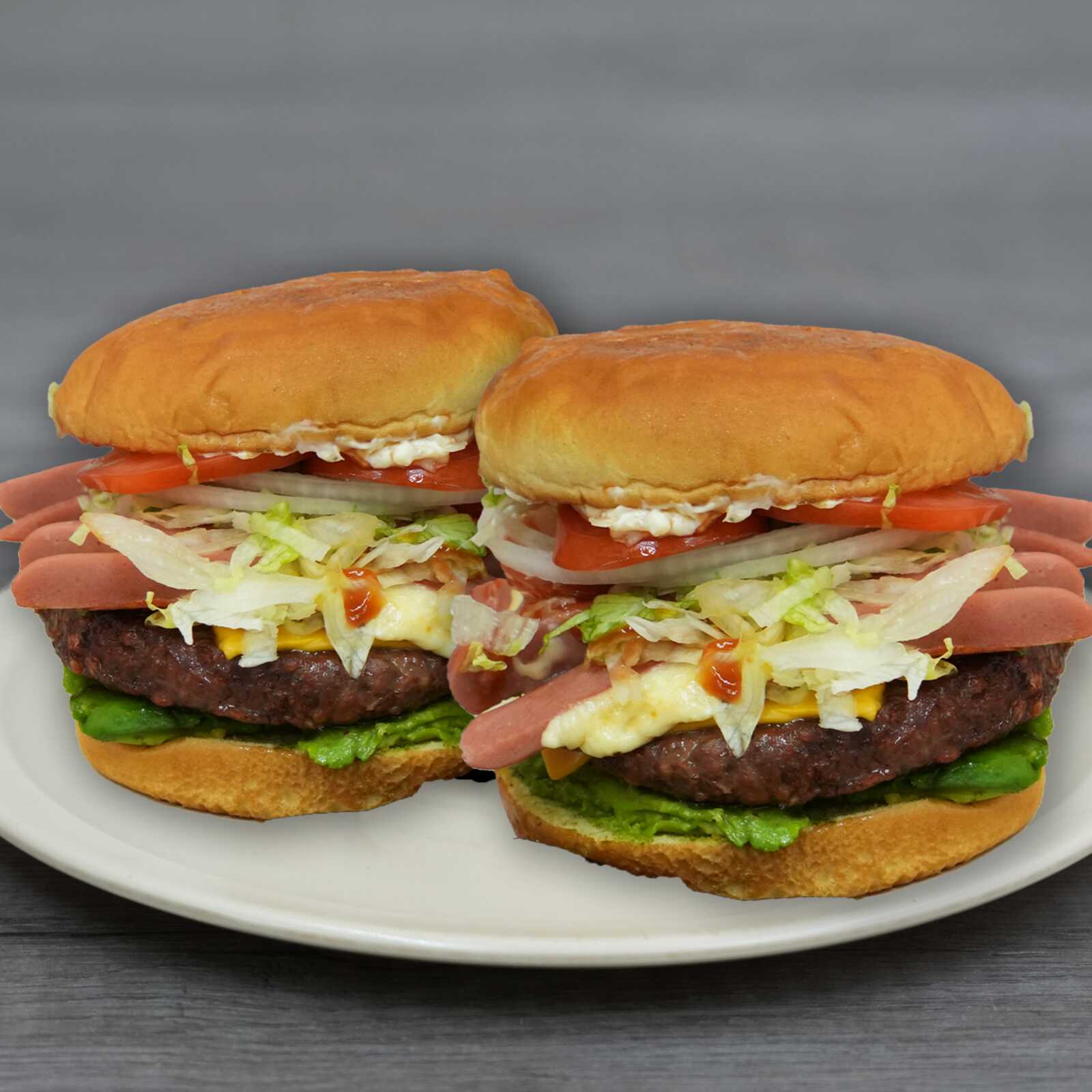 Combo de 2 deliciosas hamburguesas de jugosa carne de 1/2 de libra en pan brioche, acompañado de suculento jamón, winnie, queso amarillo, mayonesa, aguacate fresco, lechuga, tomate, cebolla y pepinillos.