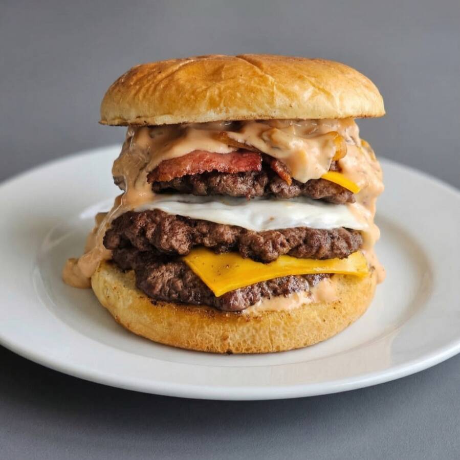 Deliciosa smash Burger Pan brioche, Triple .carne 100% sirloin smash, queso amarillo, queso asadero, cebolla caramelizada y aderezo americano.