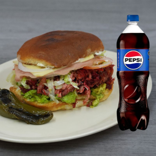 Combo de torta elaborada con pan artesanal, 200g de rica carne de colita de pavo, acompañado de suculento jamón, winnie, queso menonita, aguacate fresco, mayonesa, lechuga, tomate y cebolla, acompañada de un refresco de 600 ml