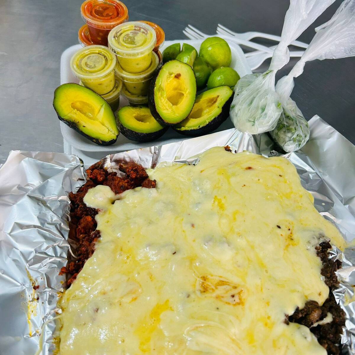 800gr De deliciosa carne de bistec más 1/2 kg de queso gouda gratinado. Incluye 25 tortillas para armar tus tacos al gusto, aguacate, limones, salsas verde y roja y cebollita con cilantro. ¡Ideal para compartir y disfrutar!