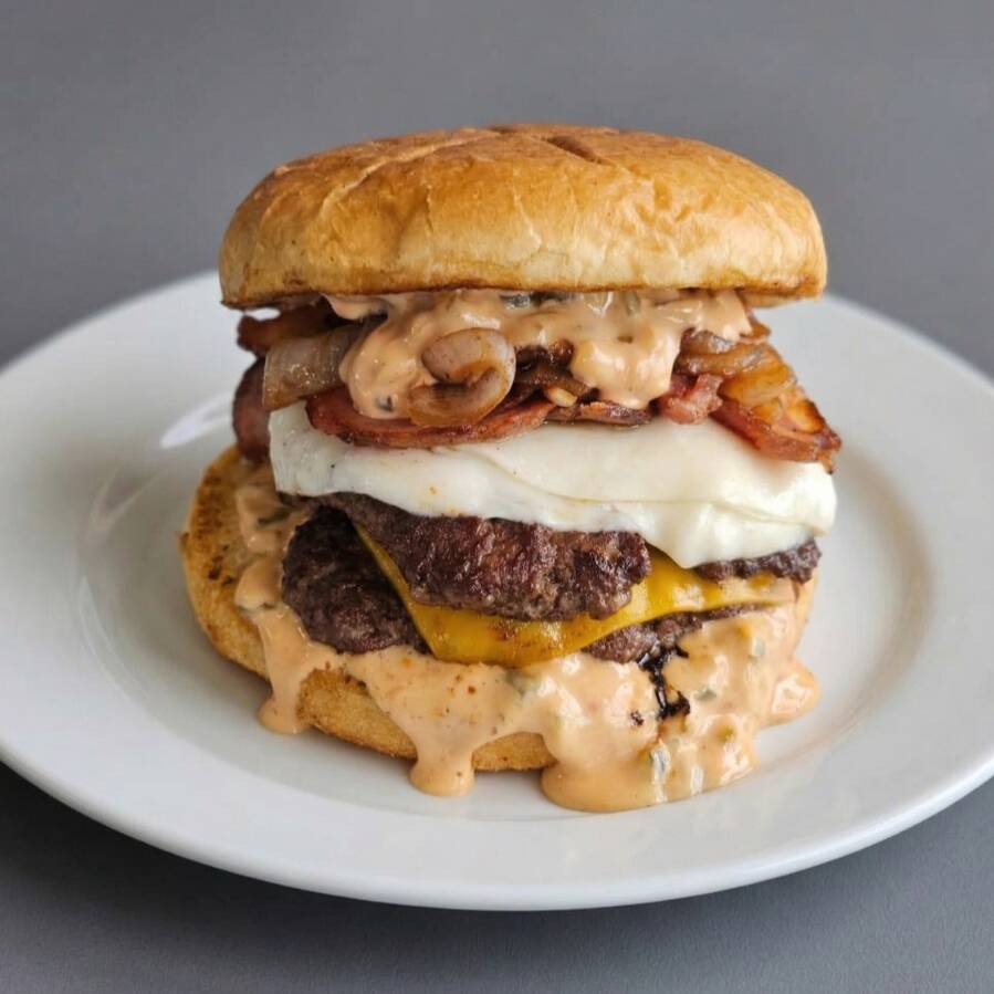 Deliciosa smash Burger Pan brioche, Triple .carne 100% sirloin smash, queso amarillo, queso asadero, cebolla caramelizada y aderezo americano.