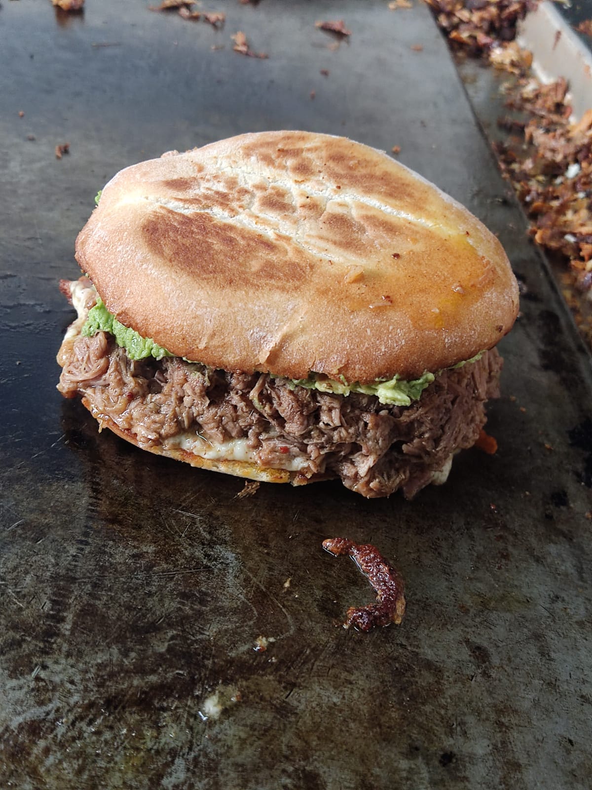 Birria de res en una cama derretida de queso blanco en pan tradicional para torta con aguacate. Acompañamiento de consomé de 8 oz.