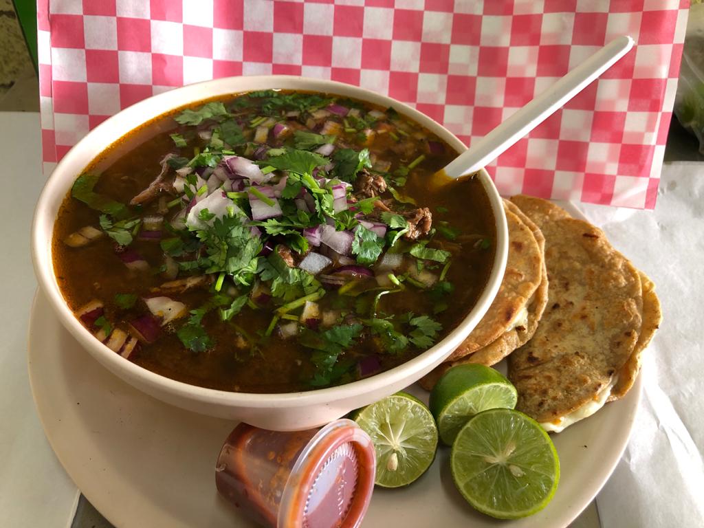 Consomé con carne , acompañado de tortillas , salsa,cebolla y limón.