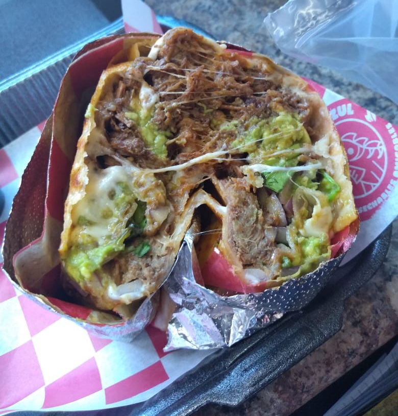 Burrito en 2 Tortilla de harina estilo sonora (85g c/u) rellenas de birria con queso, cebolla con cilantro(opcional), guacamole doradito. Lleva su consomé de 8 oz.