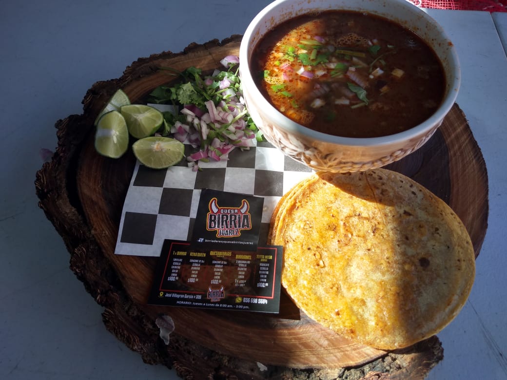 Litro consome de birria de res, con carne y sopa instantánea ramen. Acompañado de 2 quesadillas de maíz sencillas. Incluye palillos.