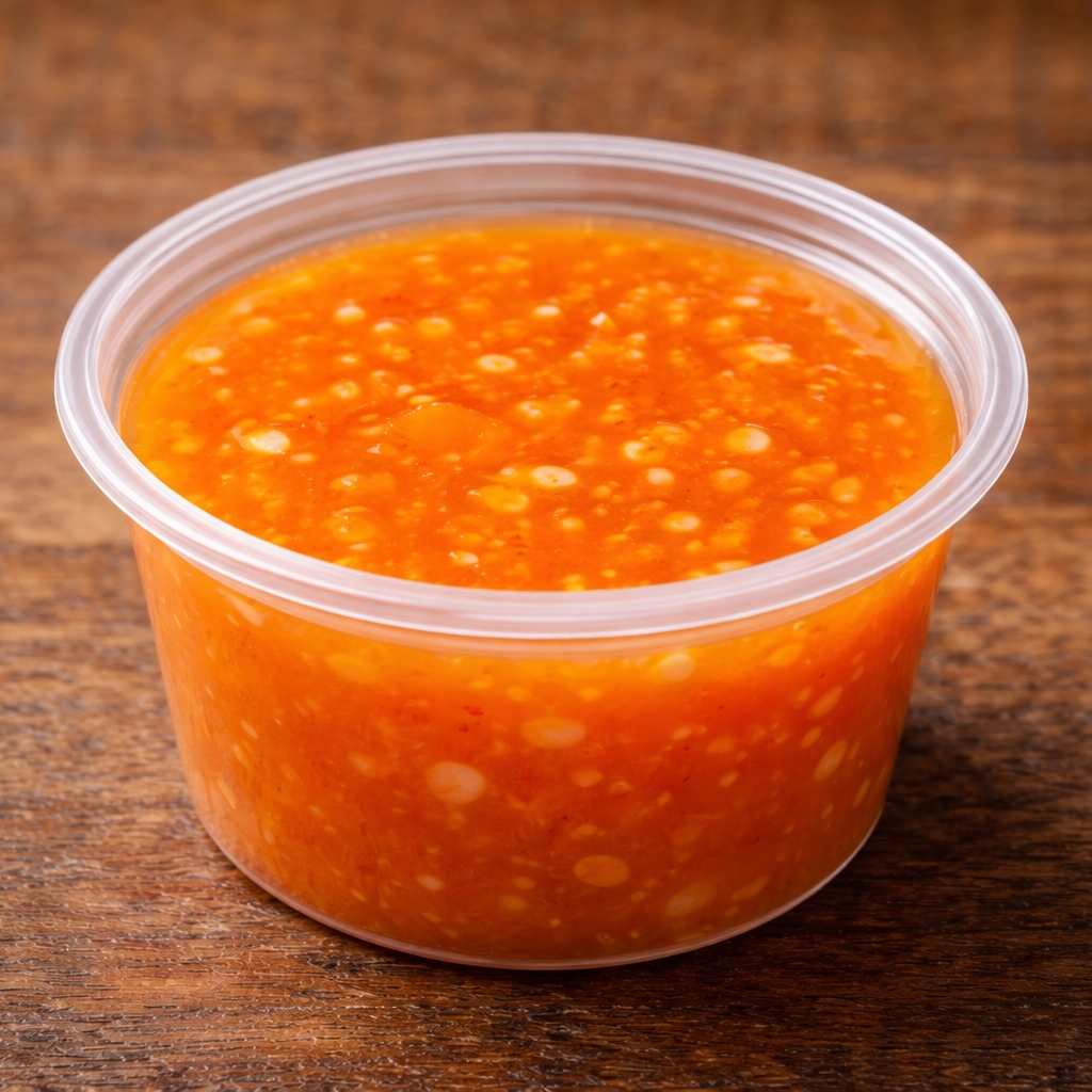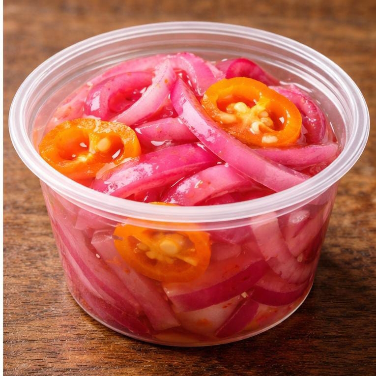 Medio litro de Birria + Refresco de lata. Tortilla de maíz tamaño mesa. Incluye Salsita picosita hecha con chile habanero y chile de árbol, Cebollita con cilantro y Cebollita morada curtida con chile habanero.