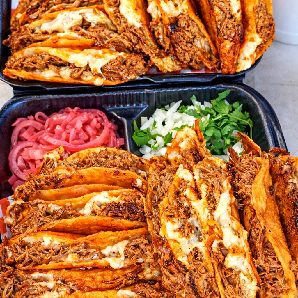 Orden Con 4 Quesabirrias de Maíz + Consomé 1/2 litro. Tortilla de maíz tamaño mesa. Incluye Salsita picosita hecha con chile habanero y chile de árbol, Cebollita con cilantro y Cebollita morada curtida con chile habanero.