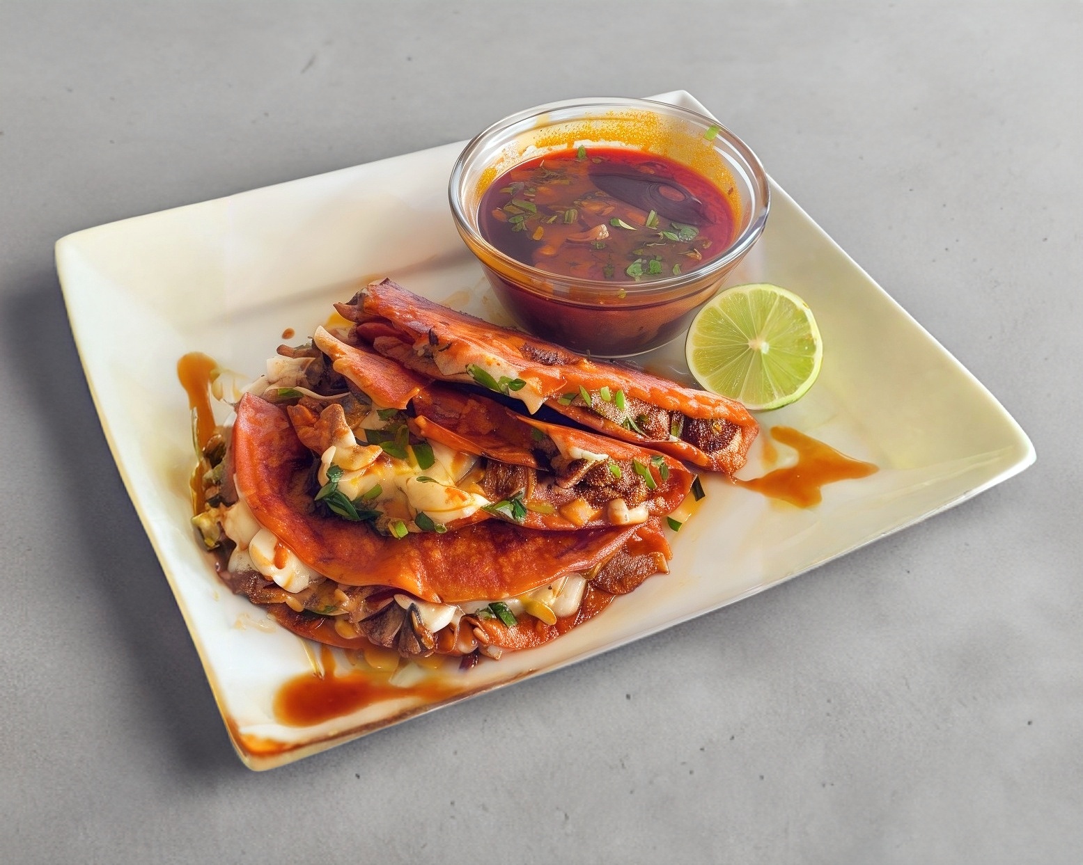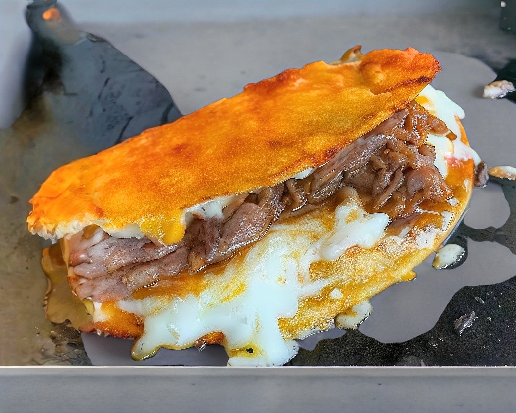 Tortilla doradita en plancha, con Jugosa carne de birria de res y quesito