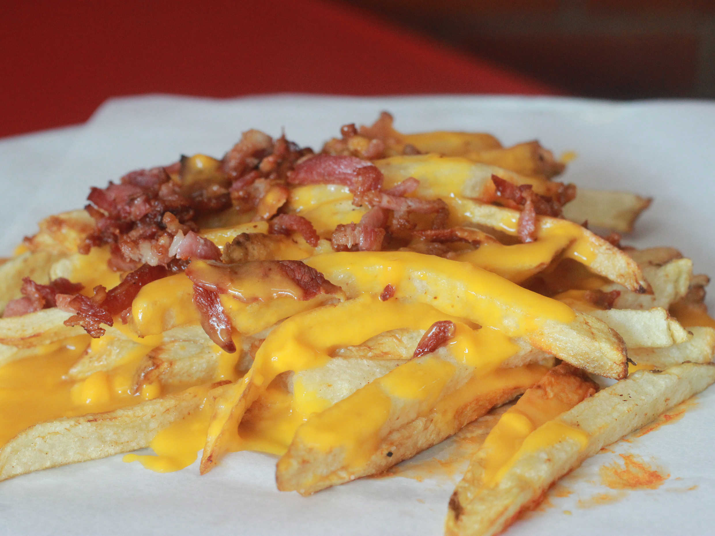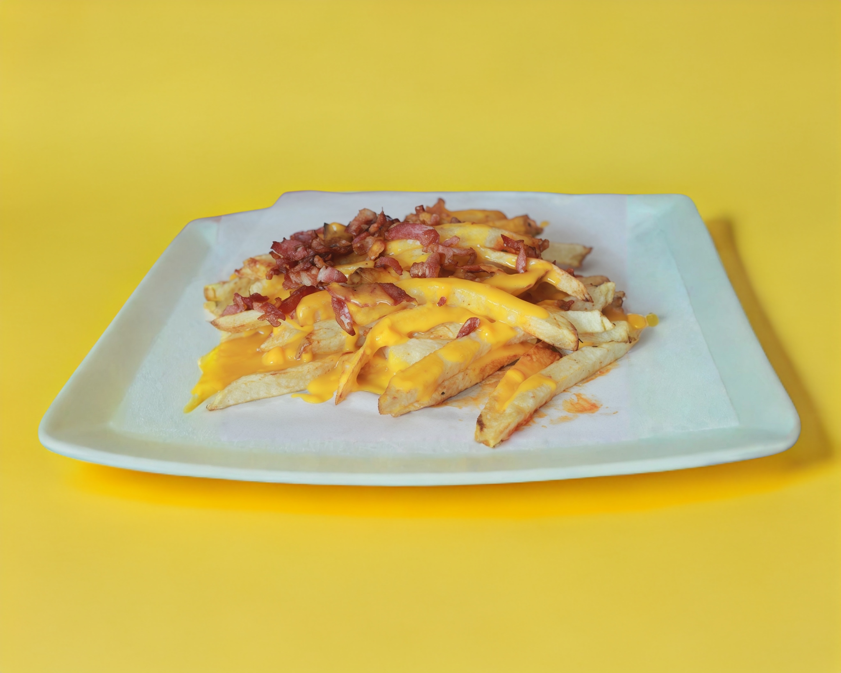 Papas recien cortadas bañadas con queso y pedazos de tocino encima