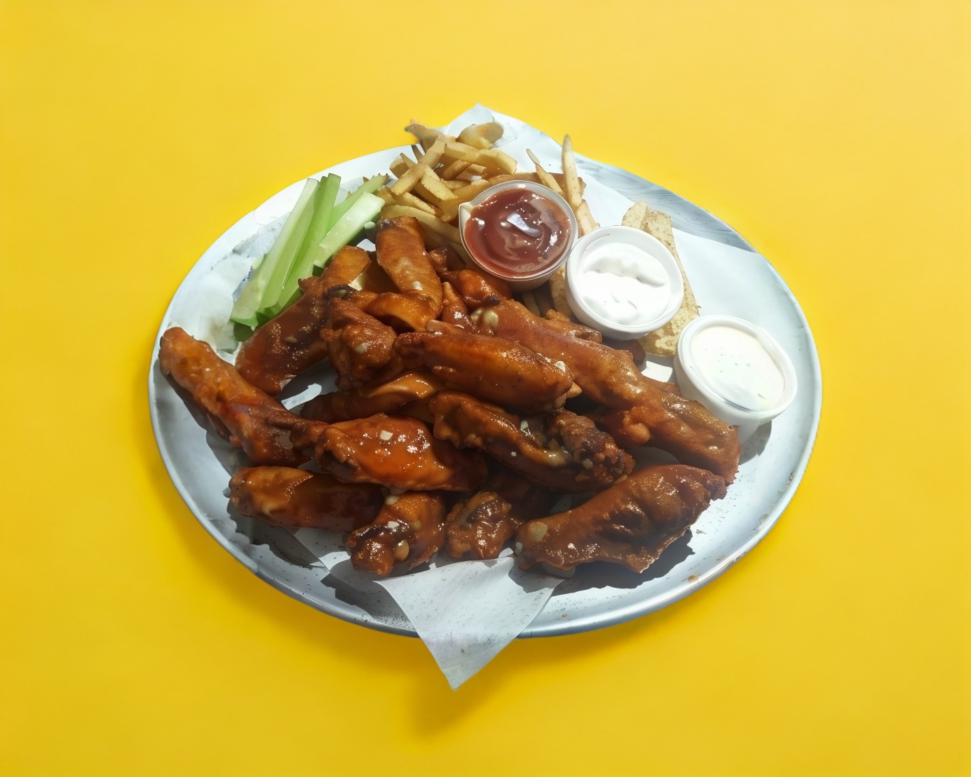 Orden de 10 alitas bañadas en el sabor de tu elección, cpn papas fritas, aderezo ranch, trozos de zanahoria y apoio
