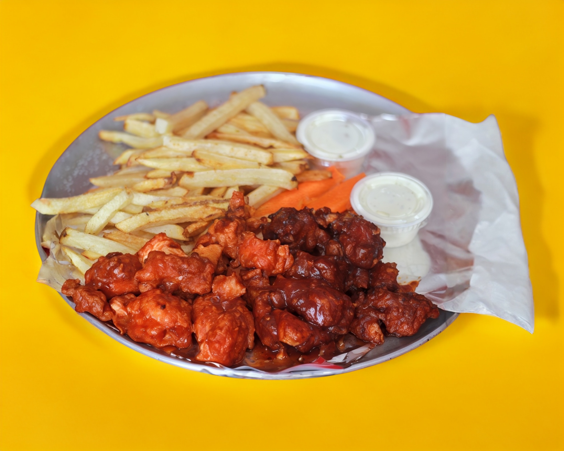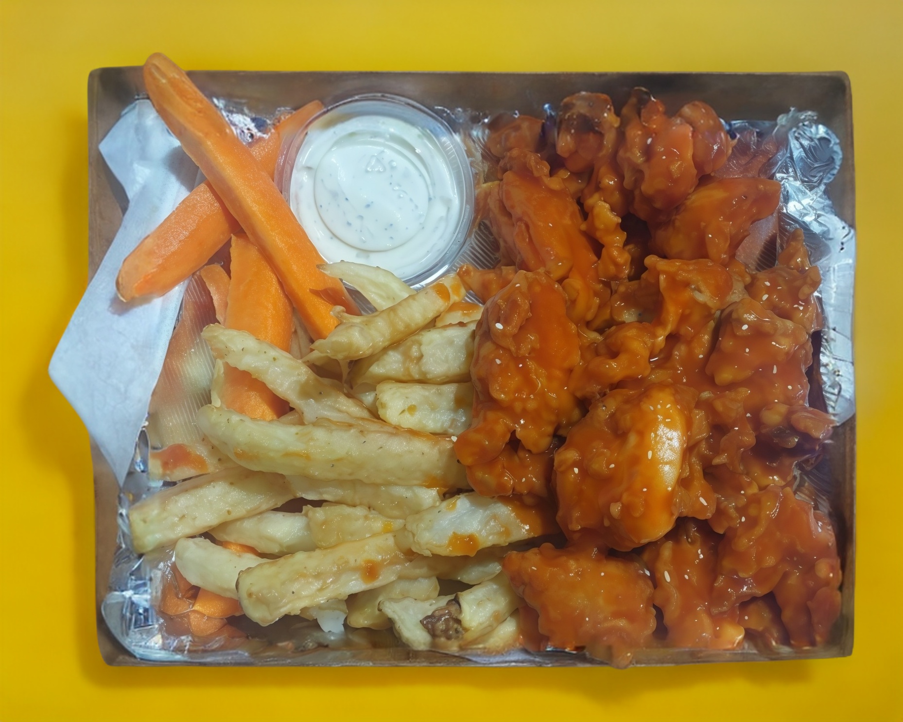 400 grs de Bonneless antes de cocinar, aocmpañados de papas fritas, aderezo ranch, trozos de apio y zanahoria