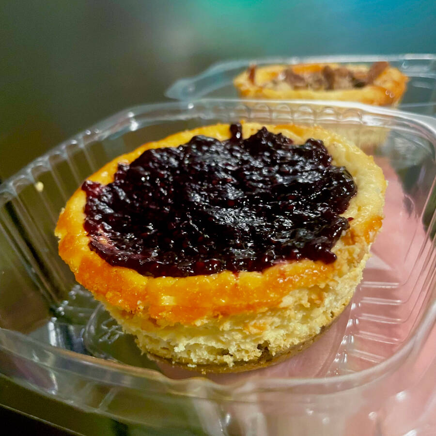 Elaborada con harina de almendra y harina sin gluten con queso crema endulzada con jarabe de agave y blueberrys