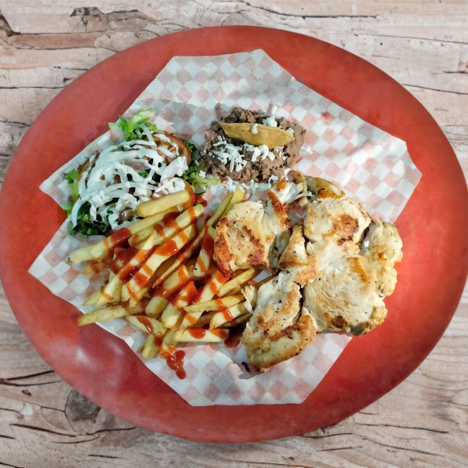 Pechuga a la plancha acompañada de ensalada, papas fritas, arroz o frijoles