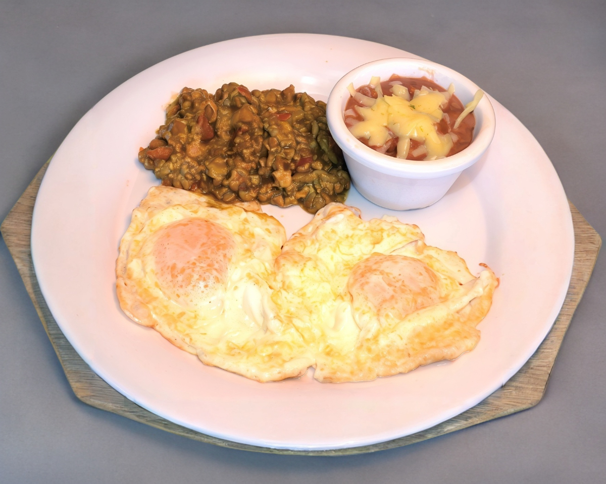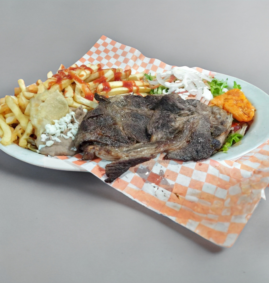 Chuleta de res a la plancha acompañado de papas fritas, frijoles o arroz y ensalada