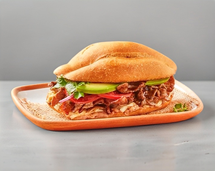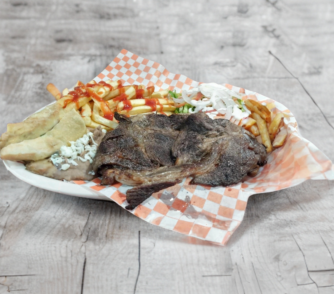 Rica tortilla Oaxaqueña con Queso, frijoles, Bisteck,chorizo, lechugay aciento de Chicarron.