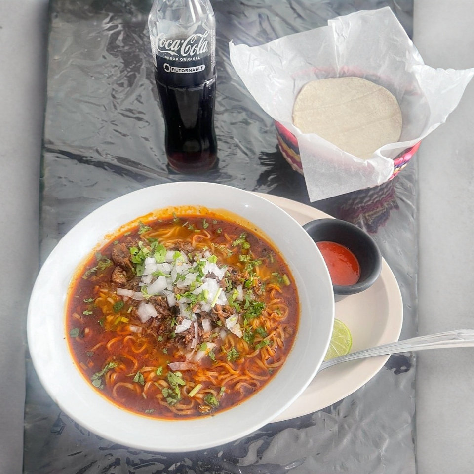 Fideos Sapporo, bañados en consomé de birria, acompañados de cebolla, cilantro , limones y la sabrosa salsa de la casa vaso de 1 Lt