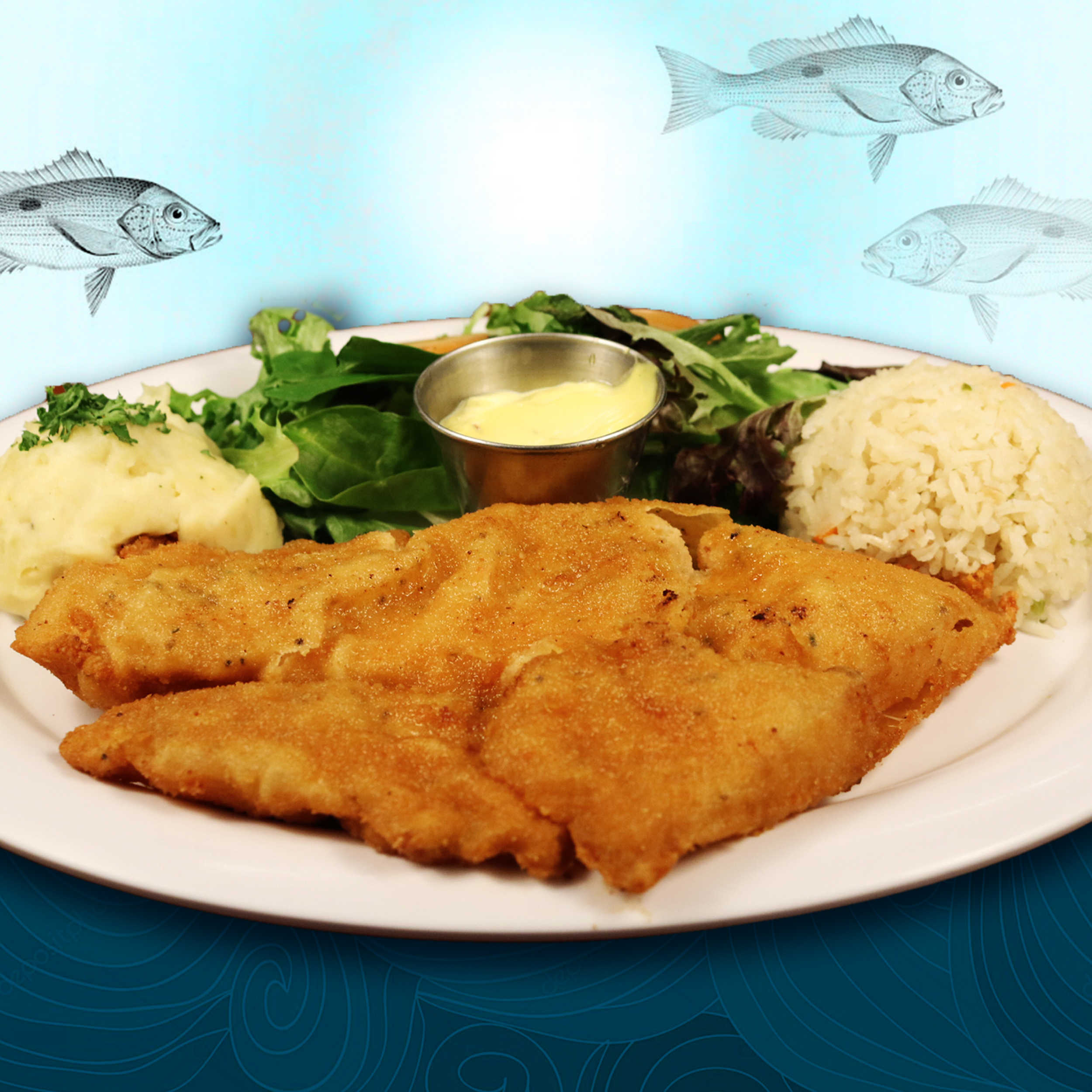 Pescado capeado en salsa especial. Pídelo por pieza u orden de 3 (La orden incluye aguacate y ensalada).