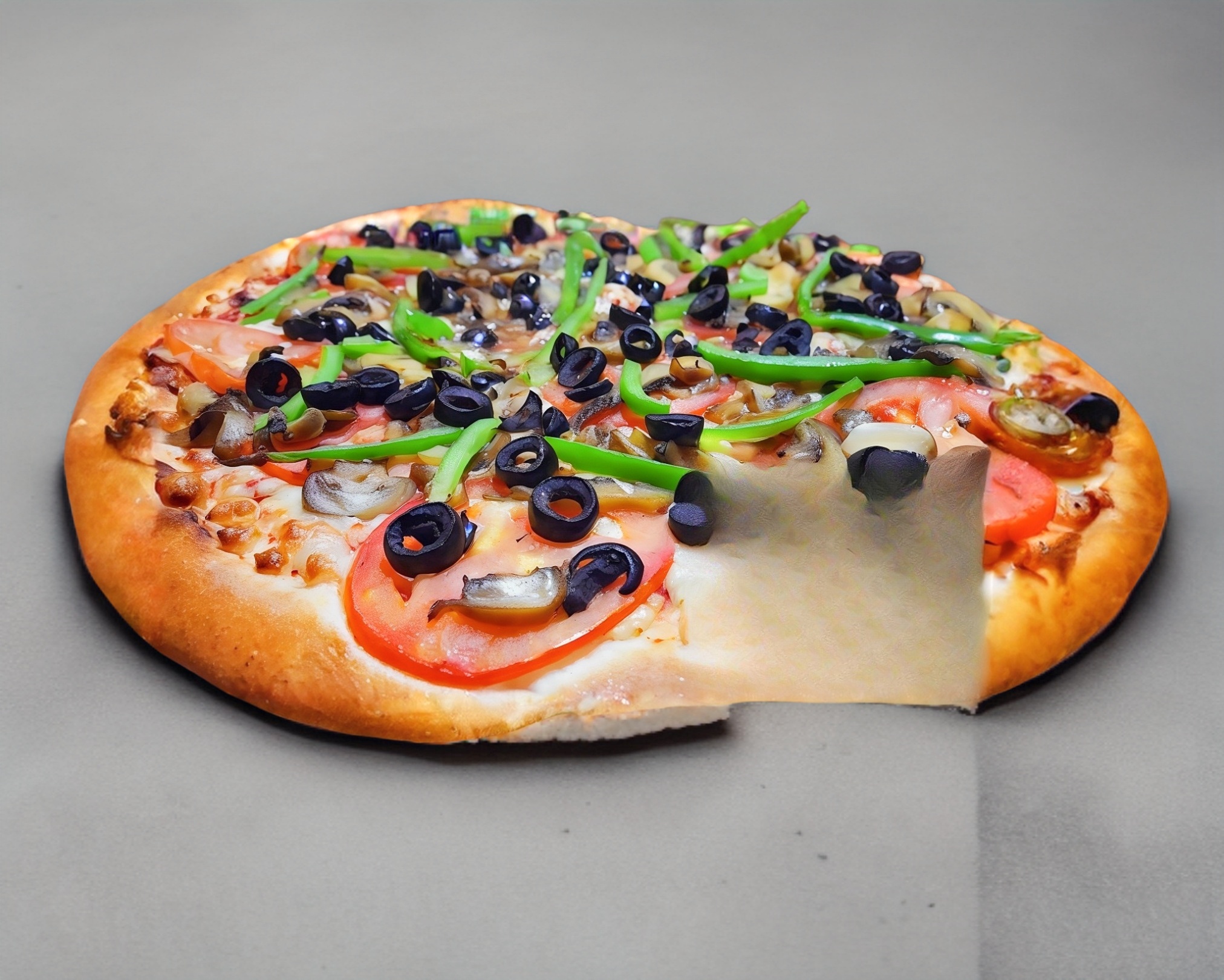 pizza grande de 14´´ con tomate, morron, champiñon y aceitunas negras