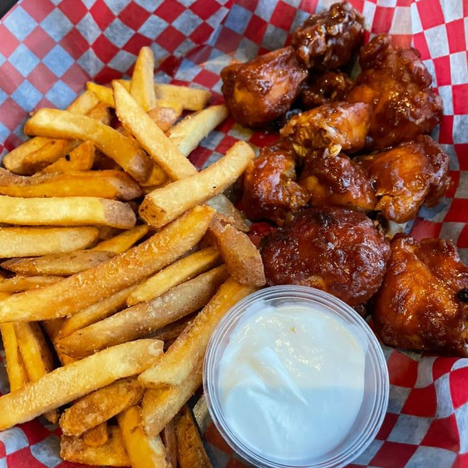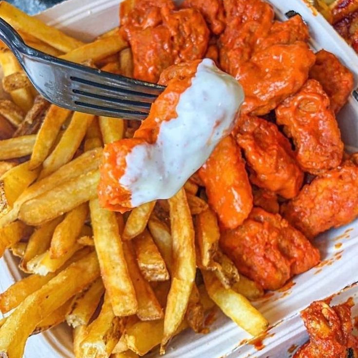 250G de deliciosos boneles bañados en salsa BBQ, acompañado de ensalada y papas fritas, enviamos catsup ranch y queso chedar