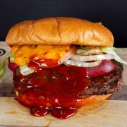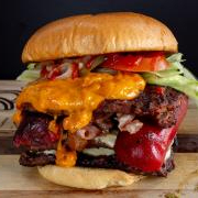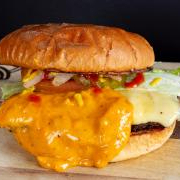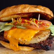 Carne 100% sirloin sazonada con la receta de la casa, asada en leña de mezquite, combinación de doble queso cheddar, doble queso blanco y doble queso tipo americano, con cebolla caramelizada, tomate, pepinillo, cátsup, mostaza y mayonesa.