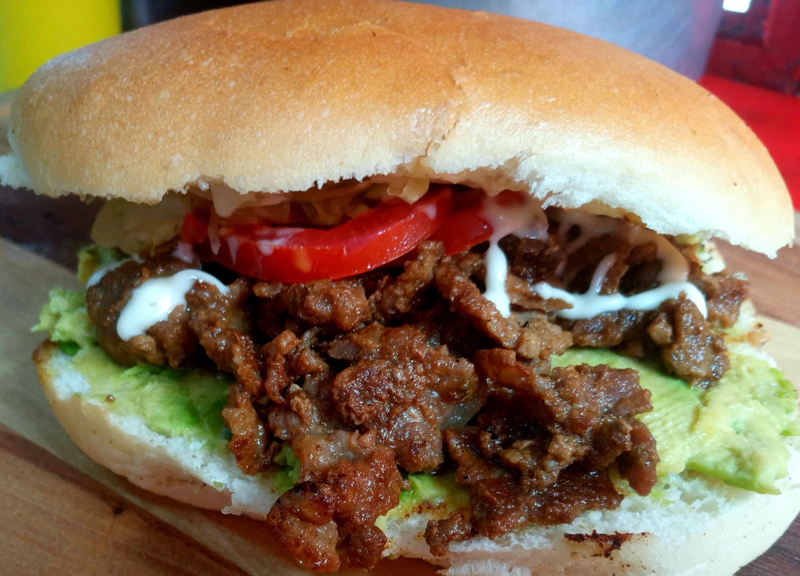 Carne al pastor con aguacate, cebolla guisada, lechuga, tomate y mayonesa.