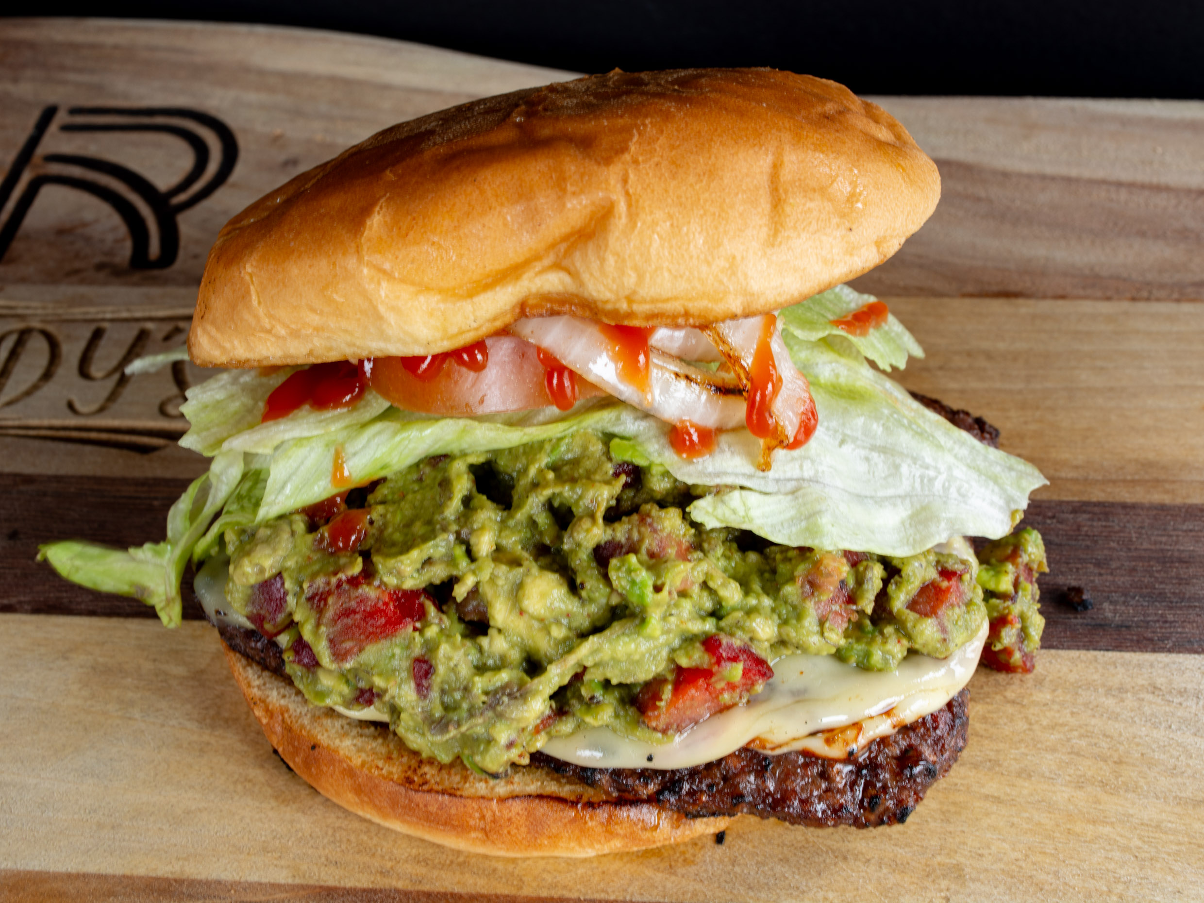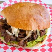 Deliciosa carne 100% sirloin asada en leña de mezquite bañada en salsa Rudy's (picosita), queso cheddar, cebolla caramelizada, tomate, lechuga y mayonesa.