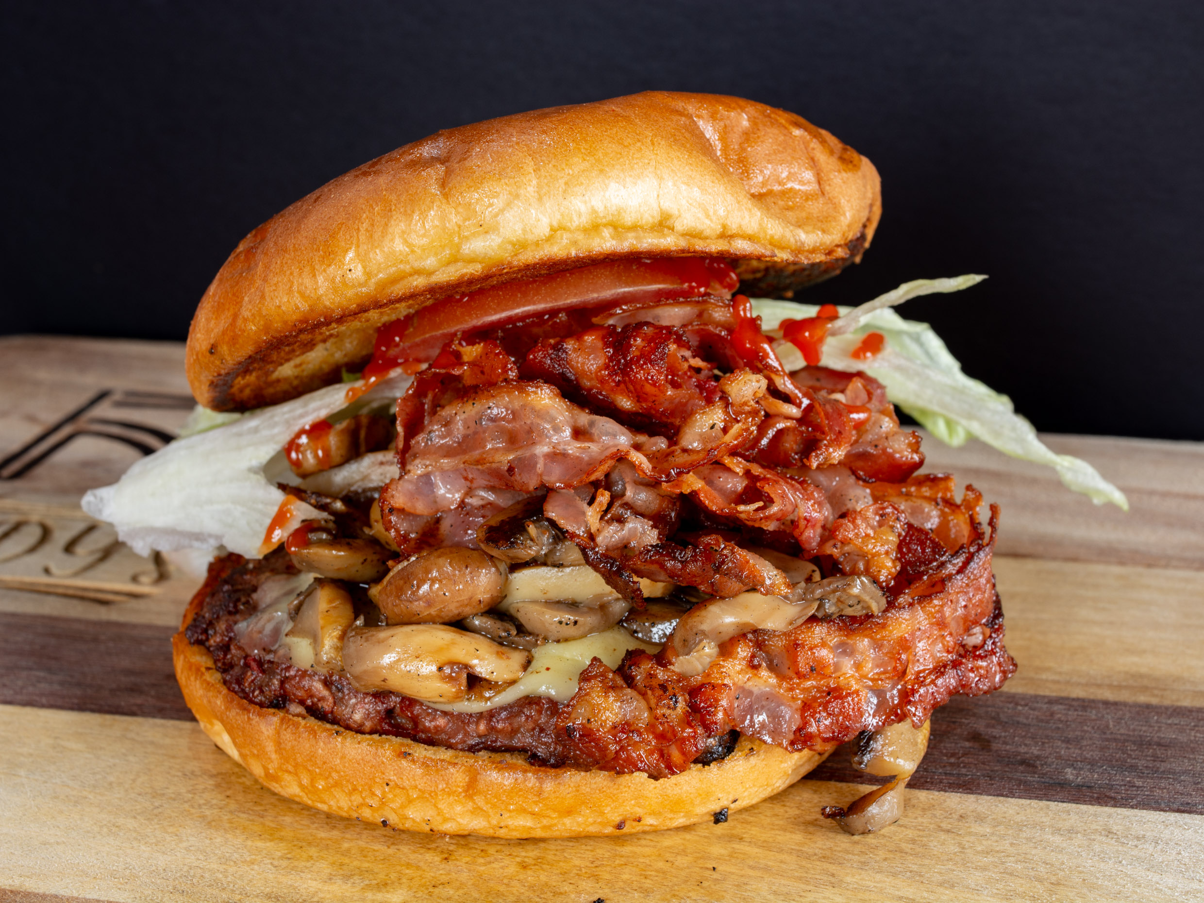 Carne 100% sirloin, queso blanco, champiñones, 3 tiras de tocino, cebolla guisada, tomate, cátsup, mayonesa y lechuga.
