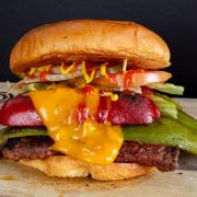 Carne 100% sirloin, queso blanco derretido, mucho guacamole, salchicha para asar en trocitos, cebolla guisada, tomate y mayonesa.