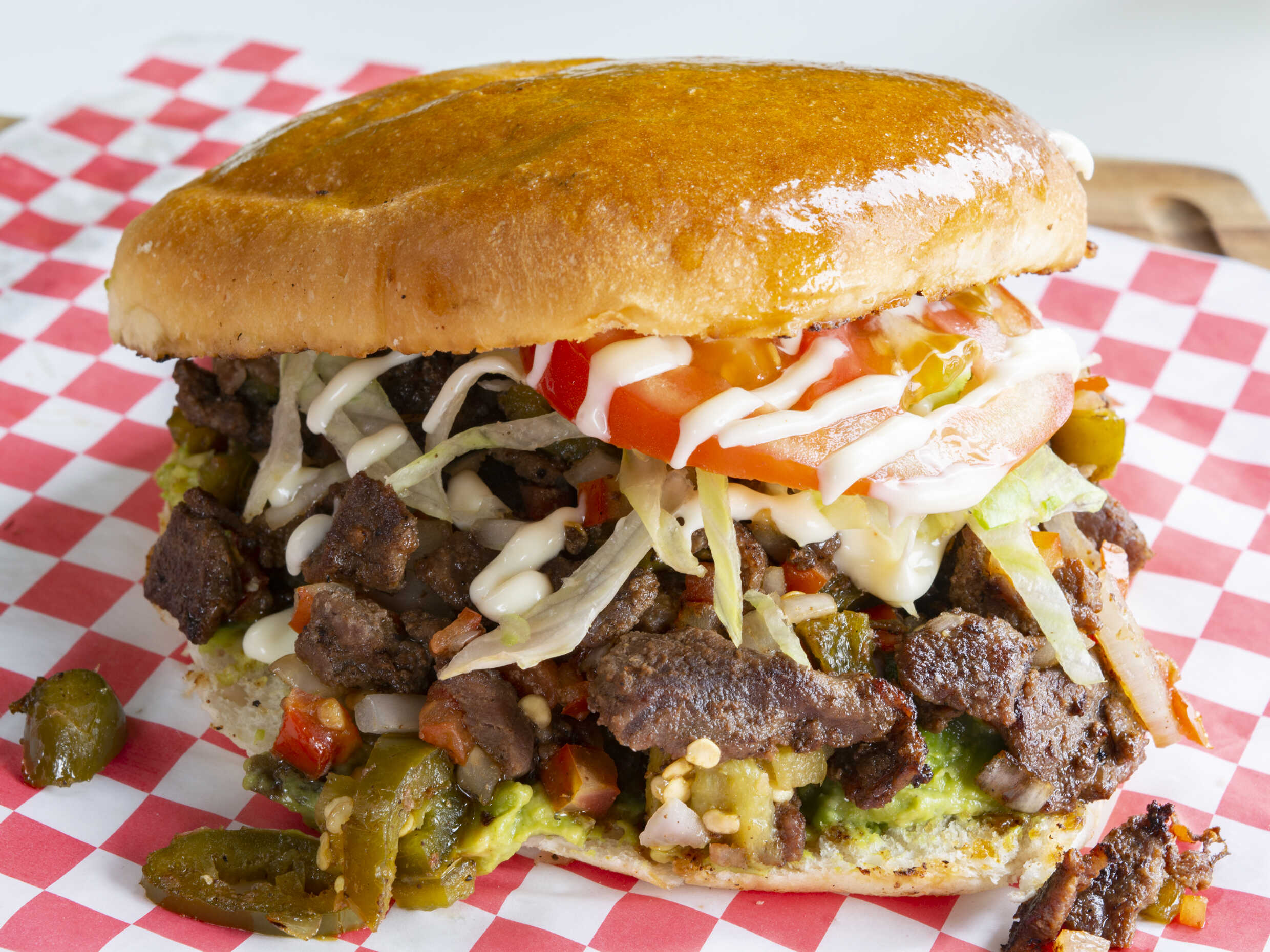 Bistec, colita de pavo, jamón, queso blanco, tocino, winnie, aguacate, cebolla guisada, lechuga, tomate y mayonesa.