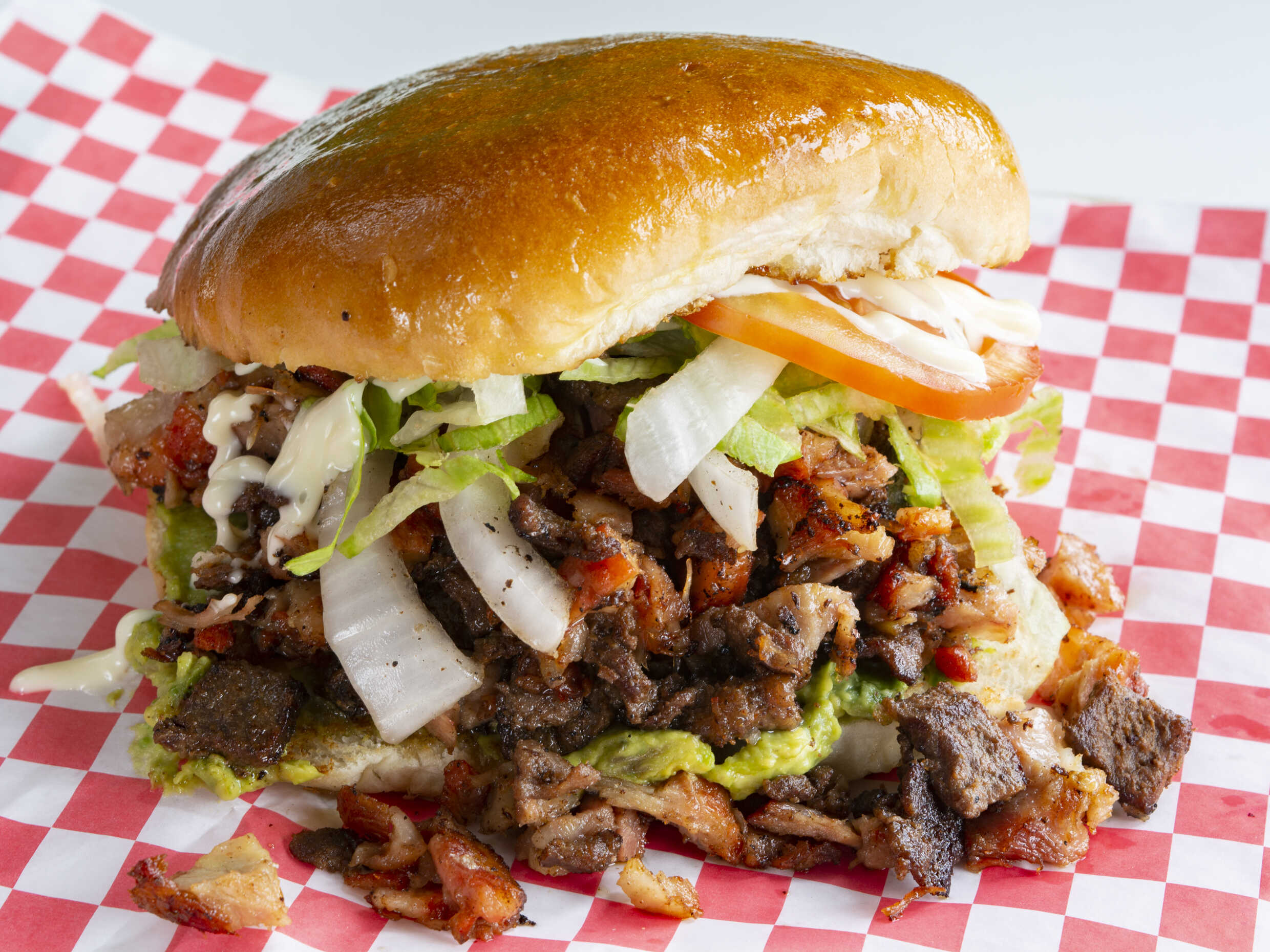 Carne al pastor con aguacate, cebolla guisada, lechuga, tomate y mayonesa.