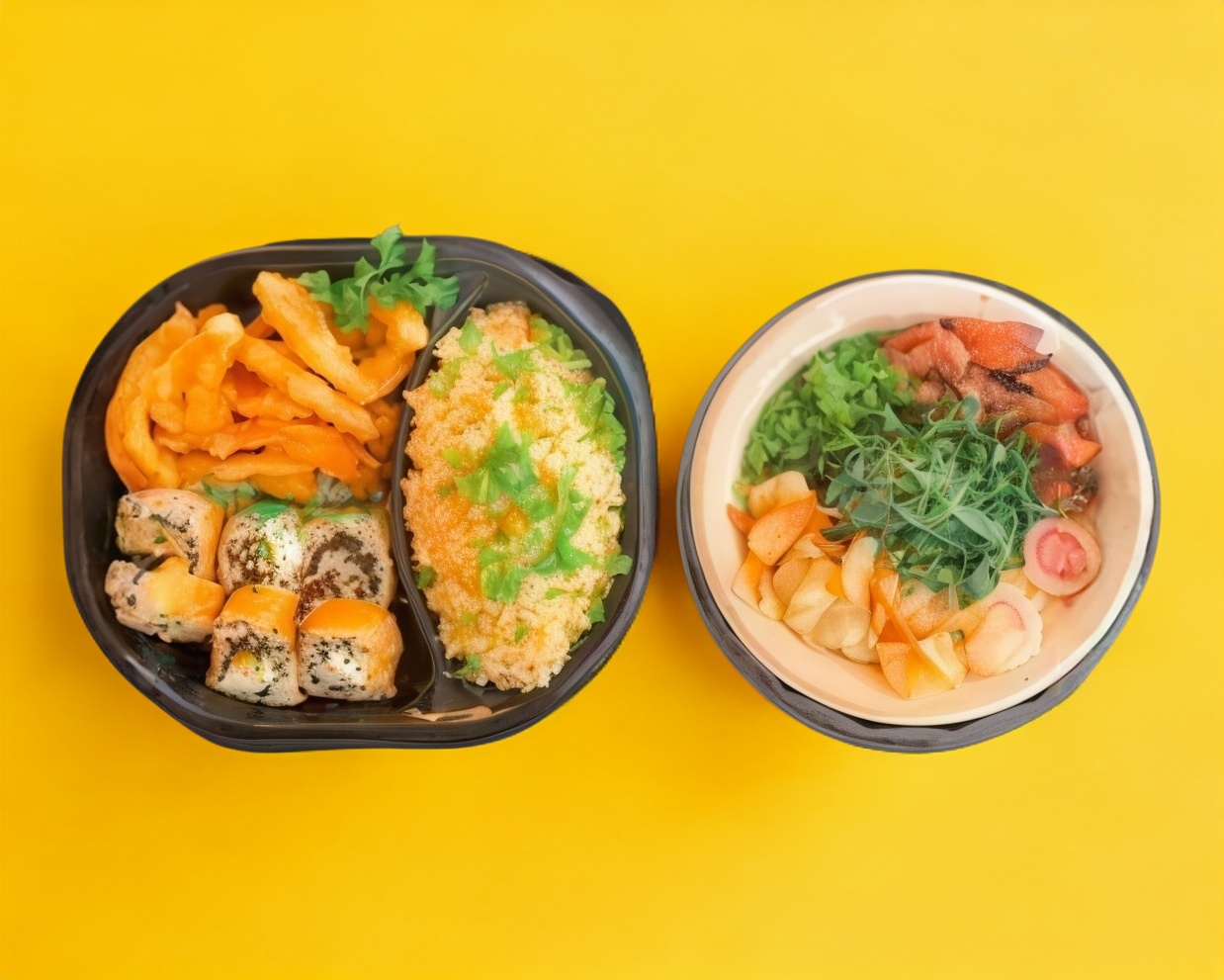 Cama de arroz en tazón con 4 toppings a elegir. 2 PROTEINAS: -Tuna Spicy -Salmon Fresco - Teriyaki de Pollo - Torino Kara-age -Surimi 2 VERDURAS: -Verduras Salteadas -Pepino Fresco -Germen de soya -Aguacate -Zanahoria