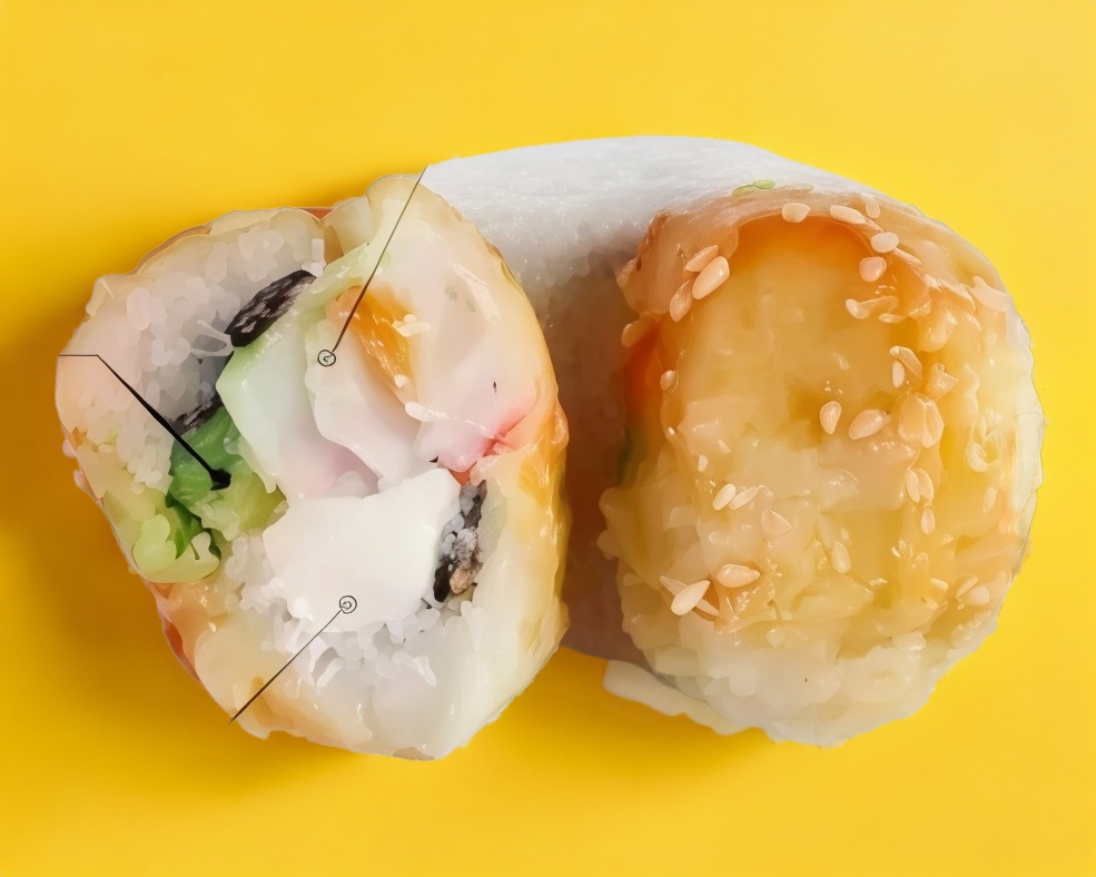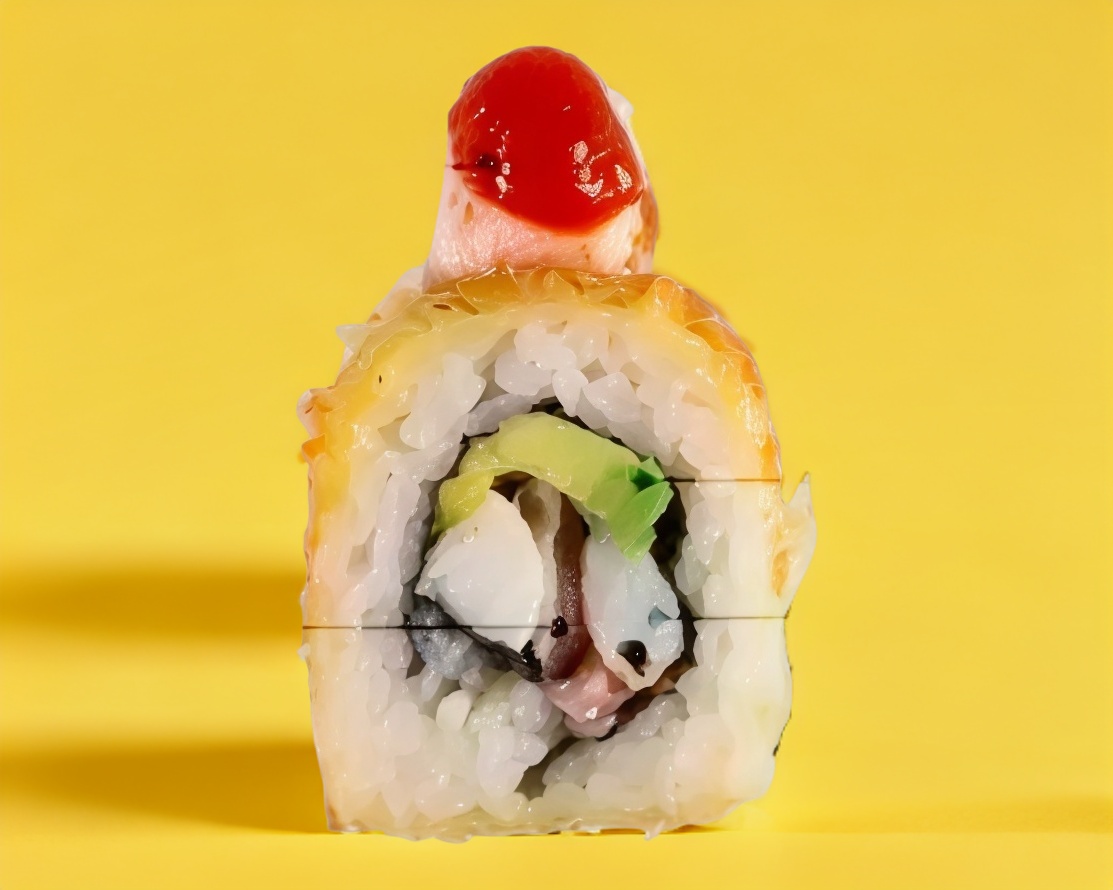 Pepino, cangrejo, aguacate y queso Philadelphia. Cubierto de masago y ajonjolí.